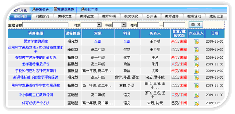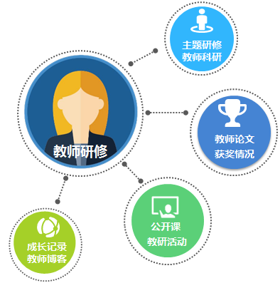 教師用戶進(jìn)行主題研修、問題討論、教師文章、教師論文、教師科研、獲獎(jiǎng)狀況、公開課、教師進(jìn)修、教研活動(dòng)、成長(zhǎng)記錄、教師博客等信息的記錄和管理。