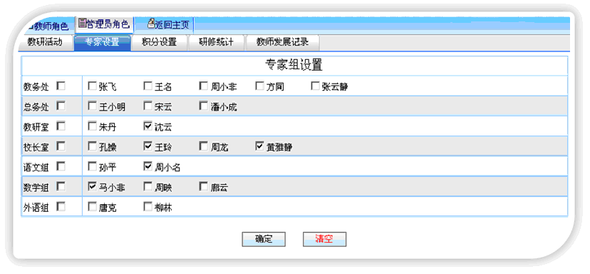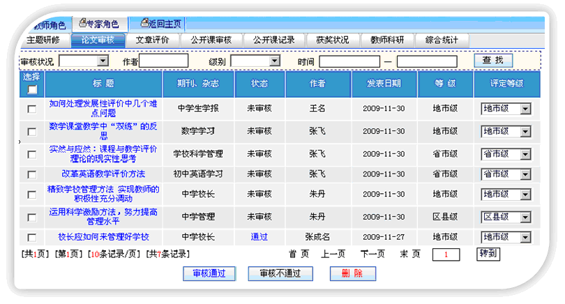 專家用戶設(shè)置教師研修主題、論文審核、文章評(píng)價(jià)、公開課審核、公開課記錄、獲獎(jiǎng)狀況、教師科研、綜合統(tǒng)計(jì)。