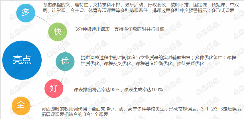 優(yōu)排課系統(tǒng)采用“人工智能神經(jīng)網(wǎng)絡(luò)算法”,一鍵智能排課,極速生成多年級(jí)課表;人工調(diào)整時(shí)具有沖突預(yù)警,并利用本校的學(xué)業(yè)質(zhì)量大數(shù)據(jù)在課表調(diào)整過(guò)程中進(jìn)行實(shí)時(shí)優(yōu)化指導(dǎo),以達(dá)到課表與教學(xué)質(zhì)量的最佳耦合;同時(shí)支持靈活、即時(shí)的教師調(diào)代課;提供多形式個(gè)性化課表。